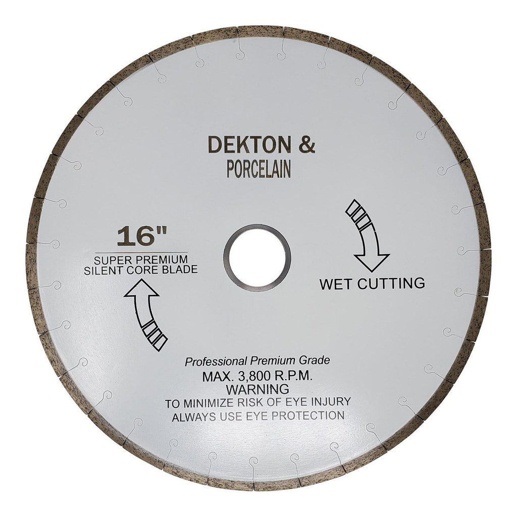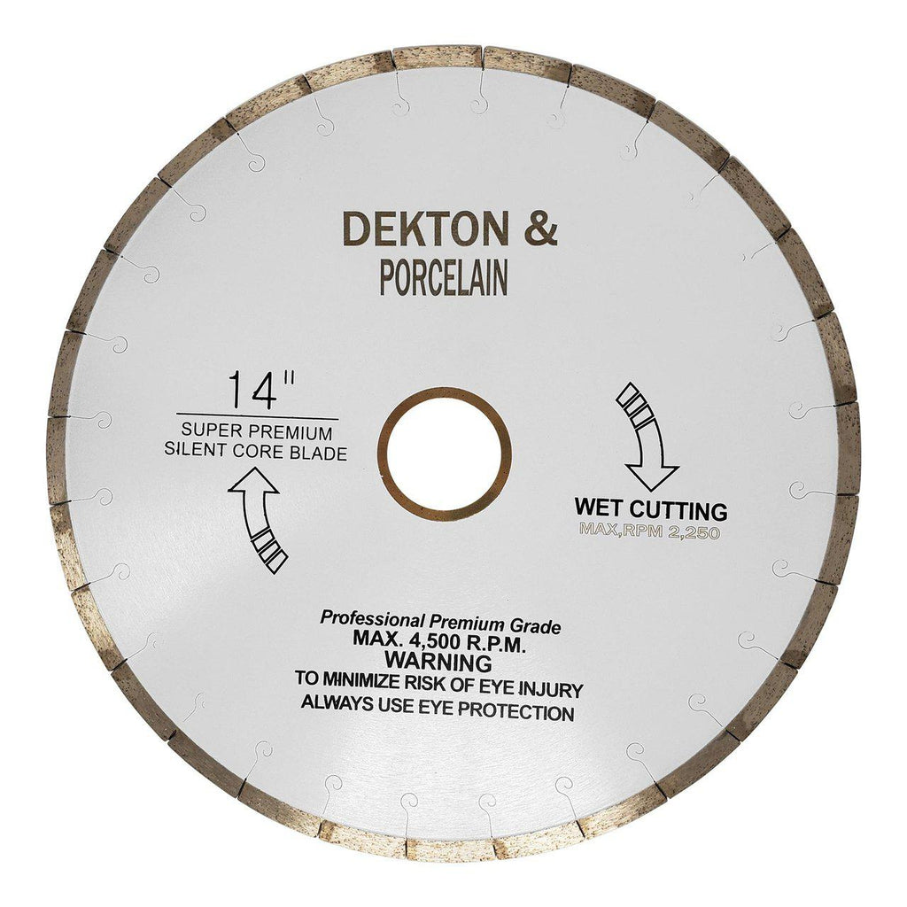 This silent core bridge saw blade is designed with a diamond matrix specifically created for processing Dekton materials. When cutting Dekton and other sintered stone materials, the blade produces a sharp, clean edge. The segments are manufactured using sandwich technology, which ensures that the cutting edge of the segment remains square for the entire lifespan of the blade. The core is made from European steel, providing enhanced strength. This increased strength minimizes blade deflection when cutting at both 90 degrees and 45 degrees.