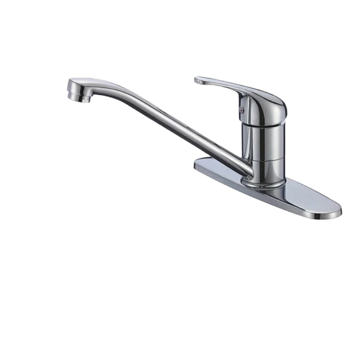 Onex Single Handle Kitchen Faucet for Hot and Cold Water Supply, Finished in Polished Chrome. This faucet features a contemporary, commercial design with a low profile and no spray function. It is equipped with a single on-off handle for effortless one-handed operation, allowing for precise control of water temperature and flow volume with just a touch; the lever is integrated into the faucet. Constructed from solid brass, the body offers excellent stain resistance and requires minimal upkeep. High-quality supply lines are provided, and it is designed for single or three hole installation for straightforward setup.